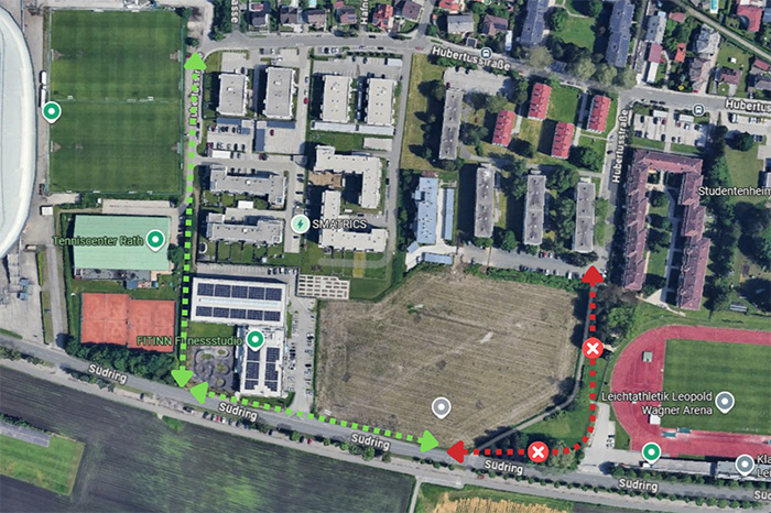 Im Zuge der Bauarbeiten am Grundstück des zukünftigen Alpen-Adria Familien- und Sportbades sind Arbeiten im Bereich des Geh- und Radweges zwischen dem Baugrund-stück und der Leopold Wagner-Arena nötig. Aus diesem Grund kommt es zu einer Umleitung für Fußgänger und Radfahrer.